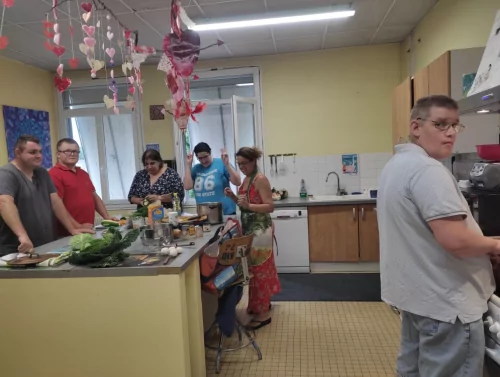 Mardi 23 juillet au soir, ce sont les saveurs du Maroc qui se sont invitées au repas des résidents du Foyer d’Hébergement Traditionnel de Montret. A leur demande, ils ont souhaité apprendre à cuisiner un couscous traditionnel et profiter ainsi du savoir-faire de Badia MENAGER, la maîtresse de maison du foyer. Une soirée mêlant partage et plaisir, à refaire avec d’autres volontaires encore nombreux à ne pas s’être essayer au maniement de la couscoussière.